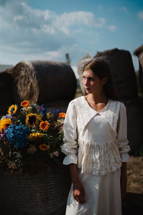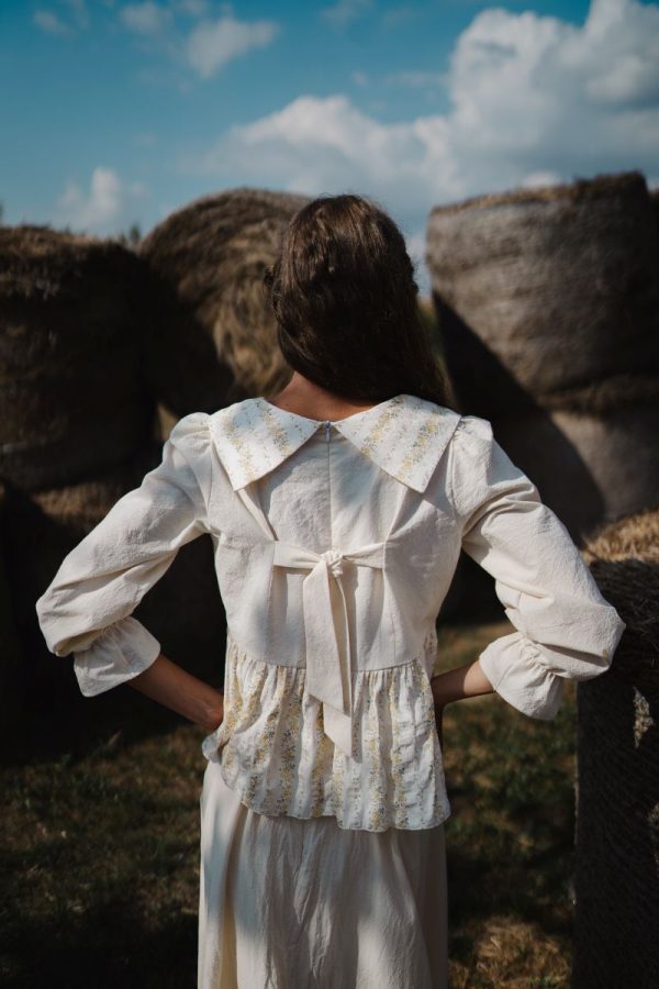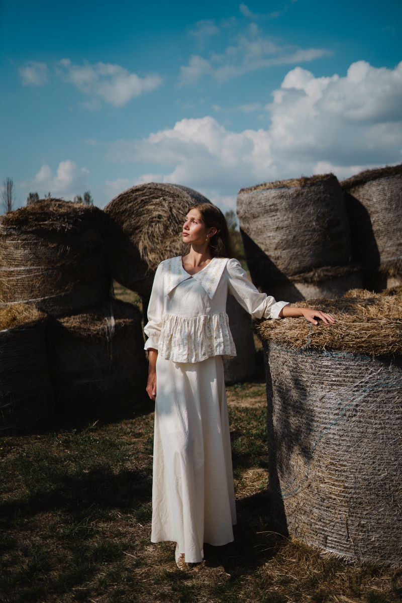 Acest outfit este o celebrare a simplității rafinate și a eleganței naturale. Bluza și fusta sunt confecționate din pânză premium natur, oferind o textură autentică și confort deosebit.Bluza prezintă un design unic, talia accentuată prin bumbac brodat aplicat, atent gândit, guler amplu,iar sistemul de închidere cu fermoare adaugă un plus de modernitate și funcționalitate emanând o notă artisanală, subtilă și sofisticată. Întregul ansamblu emană naturalețe și eleganță, fiind perfect pentru un look minimalist și elegant.